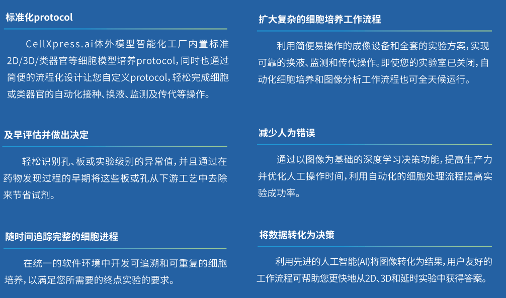 响应精准医疗与创新药物开发的快速发展需求,中心(公司)率先引进亚洲首台CellXpress.ai体外模型智能化工厂,打造“亚洲一号”类器官及器官芯片创新解决方案。该平台是由人工智能驱动的细胞培养创新中心,通过机器学习辅助监测。培养、成像和调度,改进工作流程,实现工艺自动化,并使检测更加可靠、可重现。适用发育学、毒理学、再生医学、药物筛选疾病机制和精准医学等研究,自动化可定义的工作流程配合AI为基础的决策功能,实现高效、准确、标准的2D、3D细胞和类器官的稳定培养及智能化监测,目前处于类器官技术自动化的全球顶尖水平。